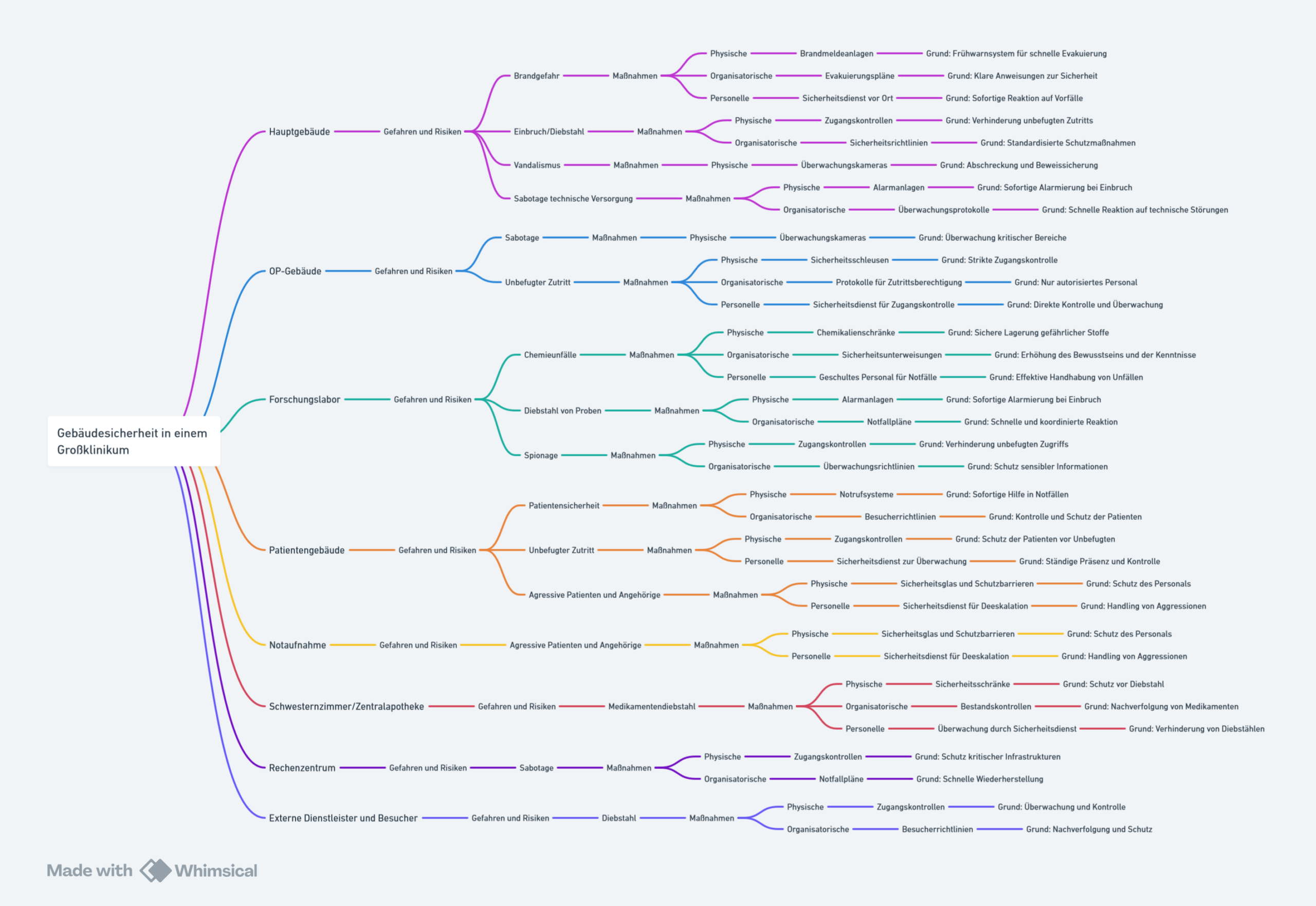 Ein Großklinikum besteht aus verschiedenen Gebäuden mit spezifischen Funktionen. Zu den wesentlichen Bereichen zählen Hauptgebäude, OP-Gebäude, Forschungslabore, Patienten- und Notaufnahmegebäude, Schwesterzimmer/Zentralapotheke, Rechenzentrum sowie Bereiche für externe Dienstleister und Besucher. Jeder dieser Bereiche hat eigene Sicherheitsrisiken und erfordert individuelle Maßnahmen zur Gefahrenabwehr. Die beiliegende Mindmap bietet einen detaillierten Überblick über die Sicherheitsrisiken in den verschiedenen Klinikbereichen und die jeweils erforderlichen Maßnahmen zur Risikominimierung.